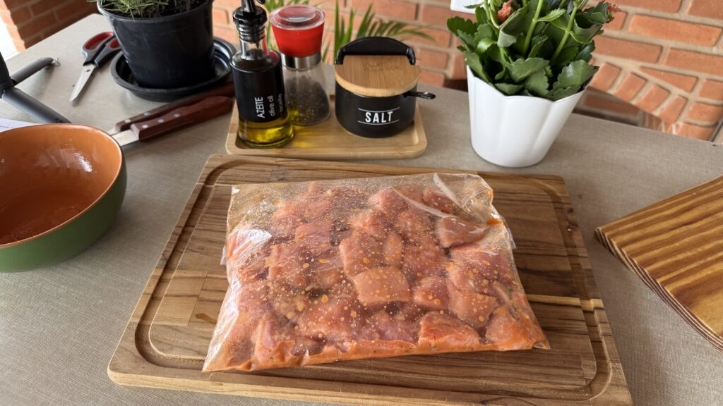 - Acrescente a carne suína e envolva bem todos os cubos no tempero.