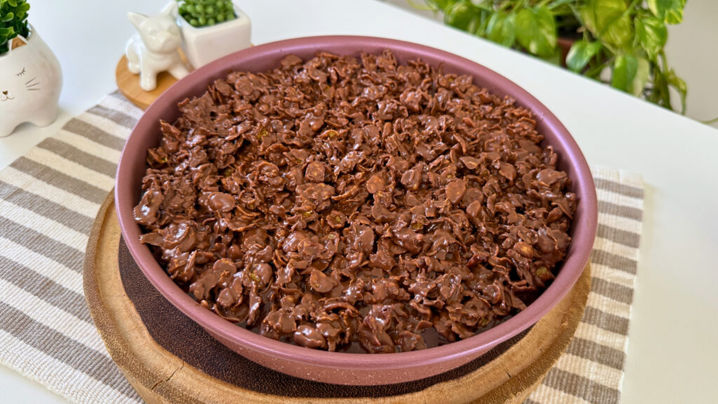 - Derreta o chocolate e junte o cereal de milho, misturando até envolver bem.