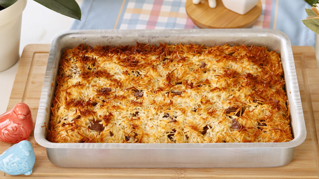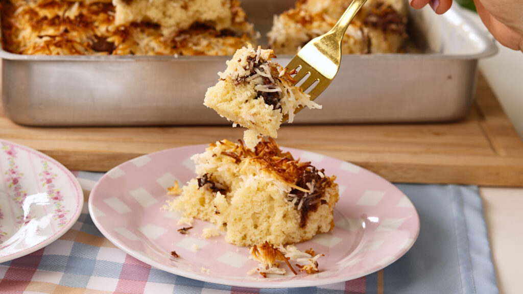 A massa macia e úmida se combina ao sabor intenso do chocolate, enquanto o coco ralado na cobertura acrescenta um toque especial que torna cada fatia simplesmente irresistível.