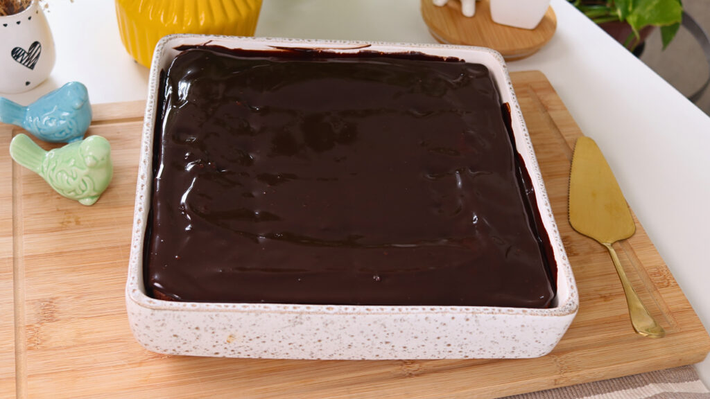 - Retire do fogo, espalhe sobre o bolo e deixe esfriar.