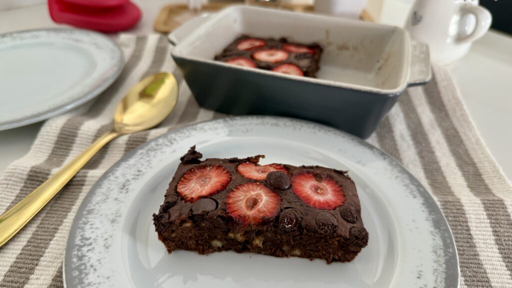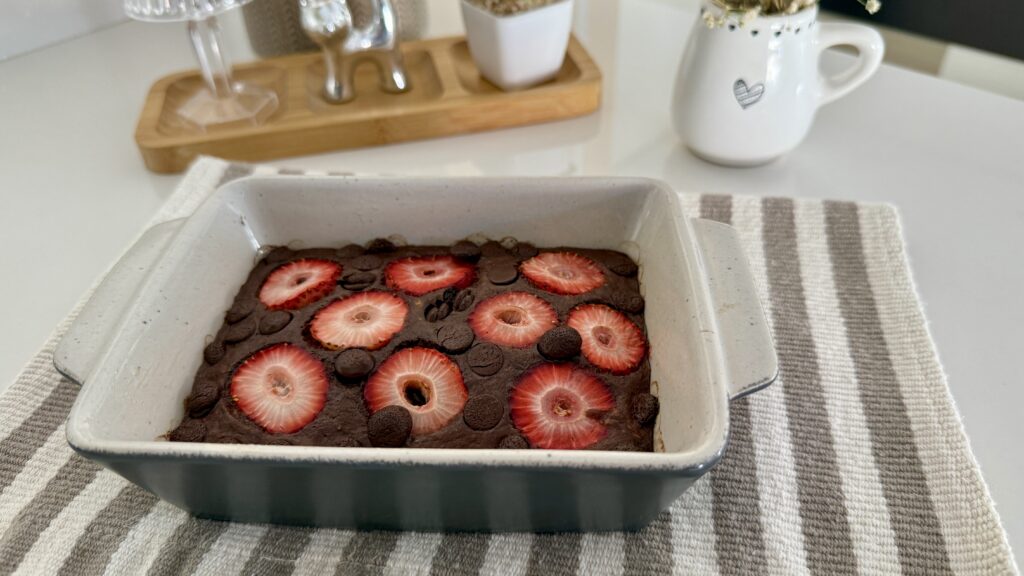 3. Despeje a massa em um refratário untado com manteiga e finalize com fatias de morango e gotas de chocolate a gosto.