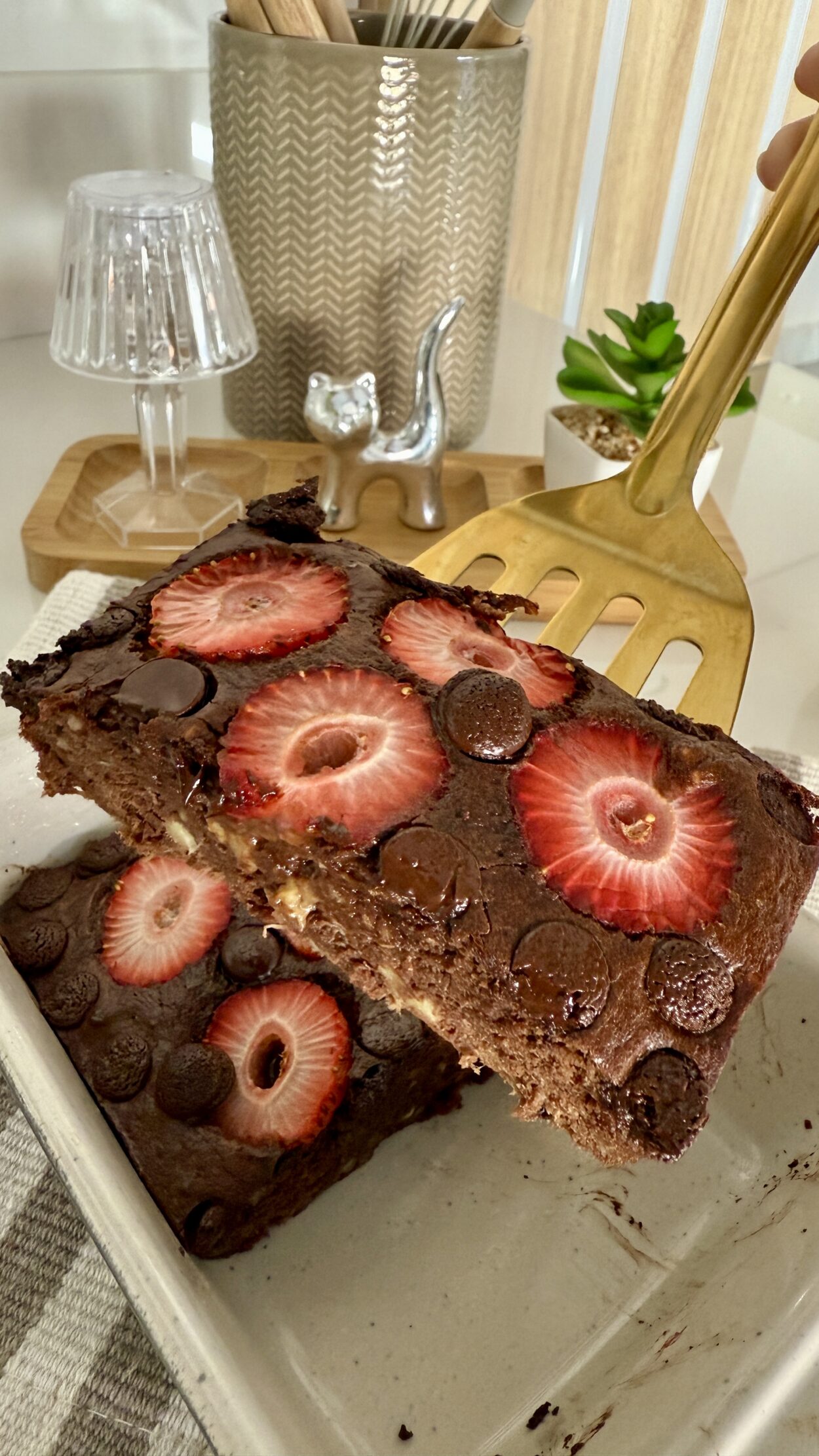 3. Despeje a massa em um refratário untado com manteiga e finalize com fatias de morango e gotas de chocolate a gosto.