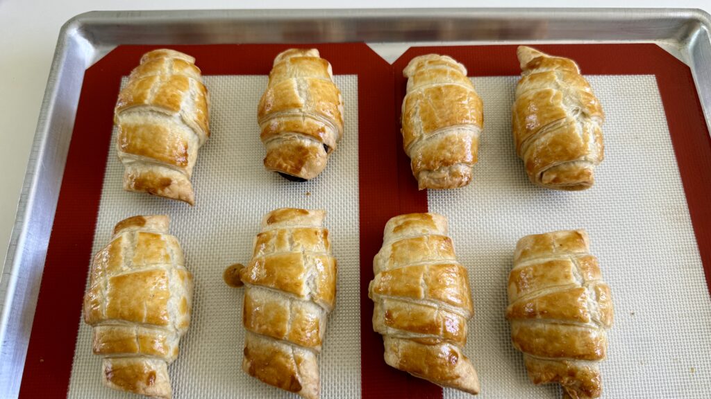 2. Disponha os croissants em uma assadeira forrada com papel manteiga ou com um tapete de silicone.