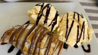 5. Sirva ainda quentinho, acompanhado de uma bola de sorvete no sabor de sua preferência.
