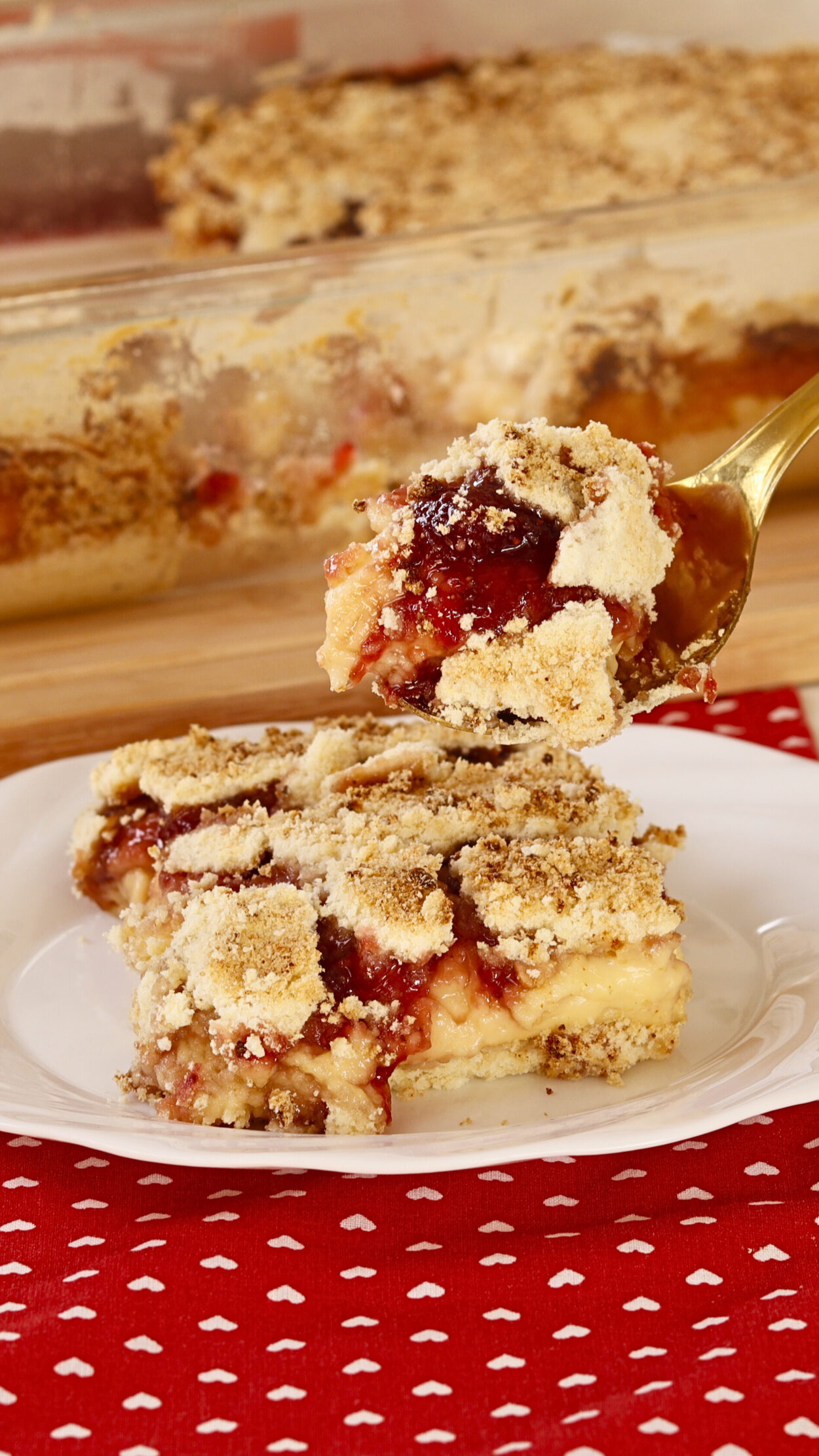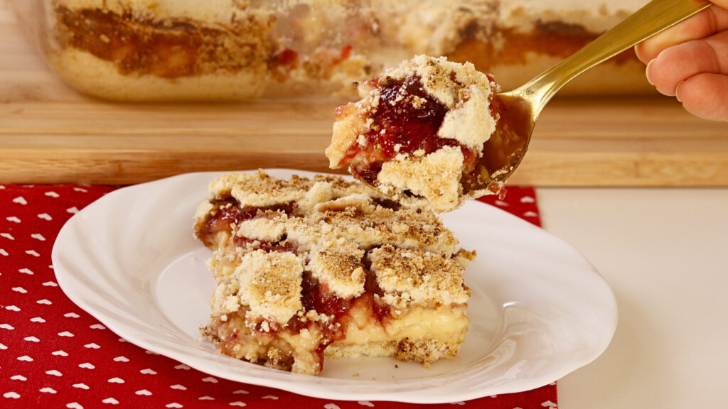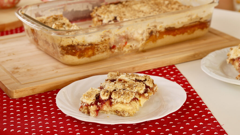 Perfeita para o café da tarde, para servir a família ou até para impressionar os amigos, essa cuca é simples de preparar, mas surpreendentemente saborosa. Cada fatia revela a combinação perfeita entre a maciez da massa, a cremosidade do leite condensado e o frescor da geleia de morangos.