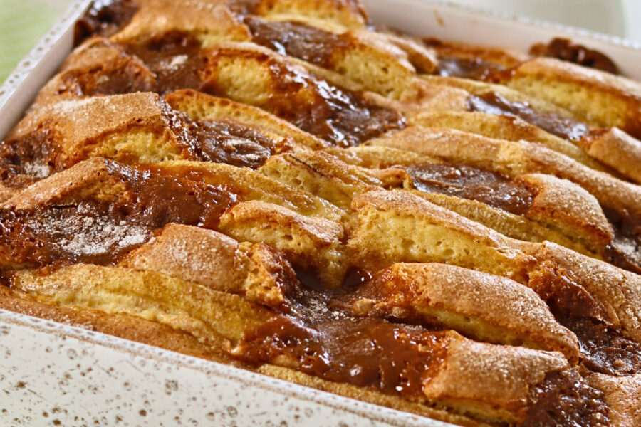 3. Em um refratário quadrado de 22cm x 22cm, espalhe o creme formando uma base, depois coloque as fatias de pão de forma uma ao lado da outra e espalhe mais creme.