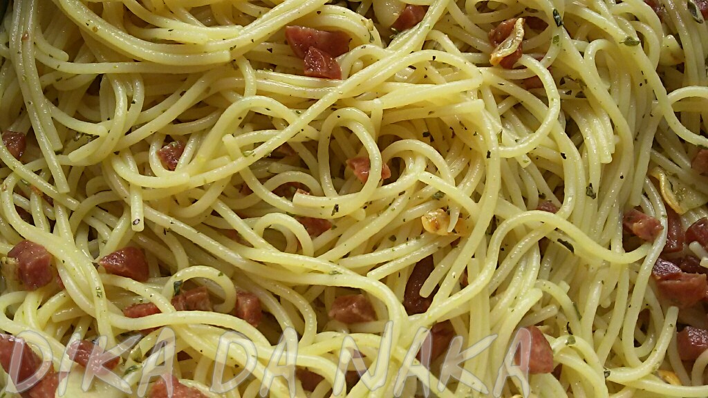 - Assim que a massa estiver “Al dente”, escorra o espaguete e misture a calabresa, o alho, tempere com orégano, sal e azeite. Fique atenta a quantidade de azeite, pois a calabresa já tem gordura. Gosto de colocar azeite até que eu perceba a massa um aspecto brilhante.
