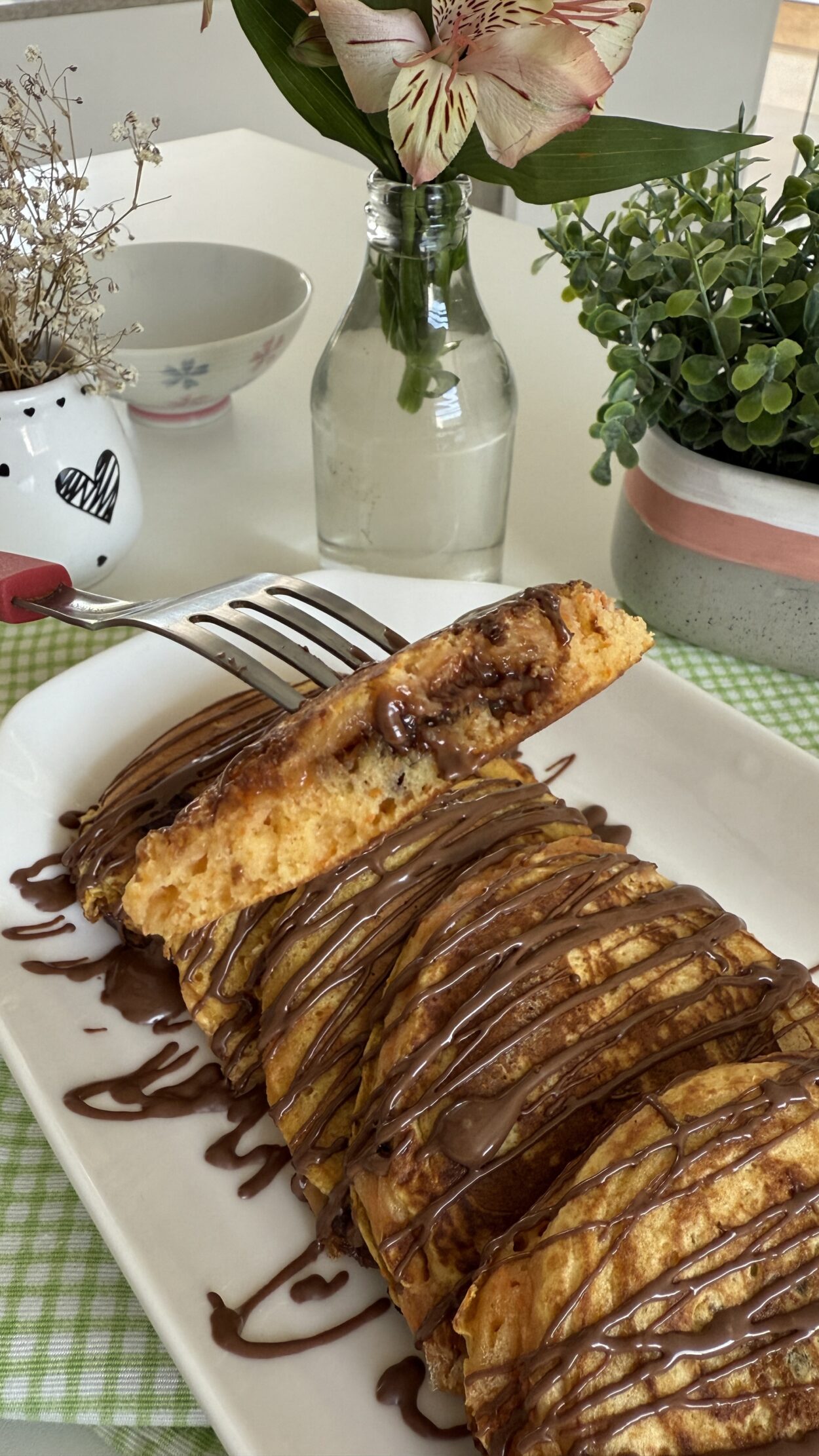 Deixe dourar dos dois lados em fogo baixo. - Finalize com chocolate derretido a gosto e sirva ainda morno.