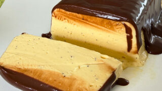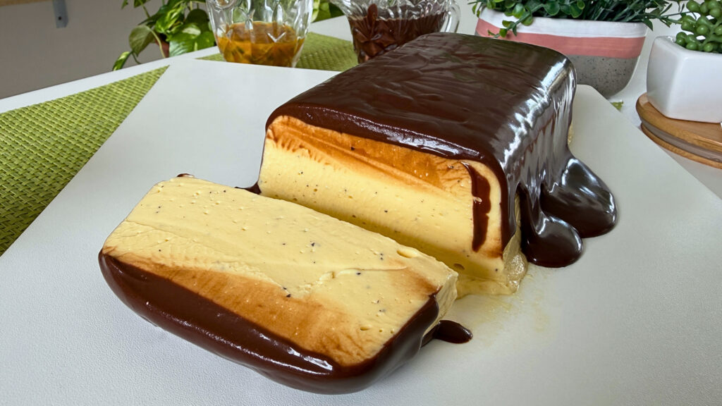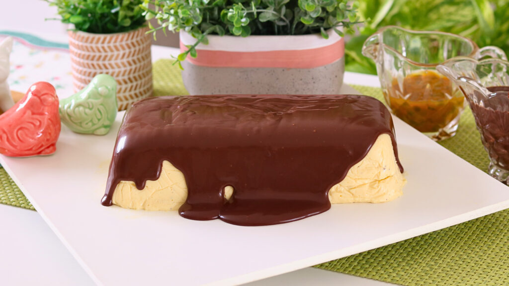 - Desenforme a mousse em um prato, retire o plástico com cuidado e espalhe a cobertura de chocolate por cima.
