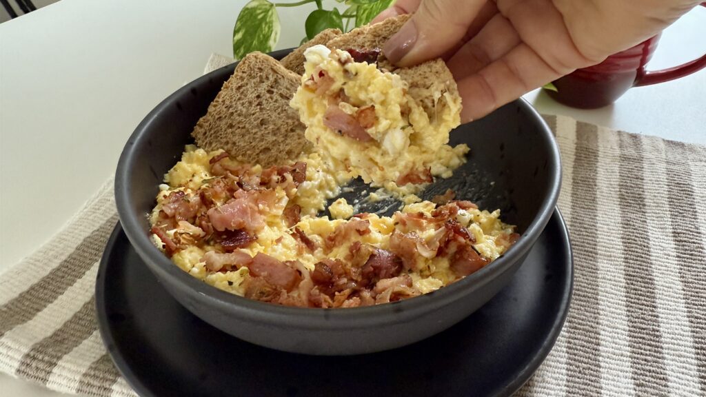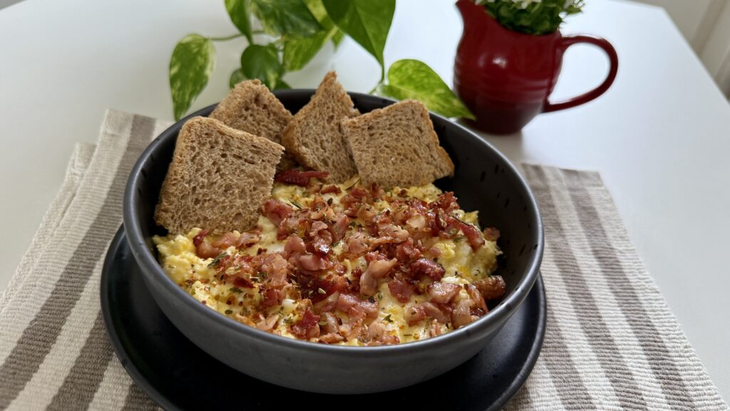 Esses ovos mexidos com bacon são simples, rápidos e cheios de sabor — perfeitos para um café da manhã reforçado ou aquele brunch de fim de semana. A combinação do bacon crocante com os ovos cremosos é daquelas que não tem erro: fácil de fazer e impossível de resistir.
