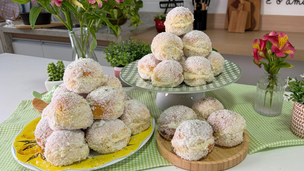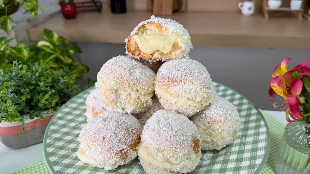 - Passe rapidamente os pãezinhos na calda de leite de coco e, em seguida, envolva no coco ralado com raspas de limão.