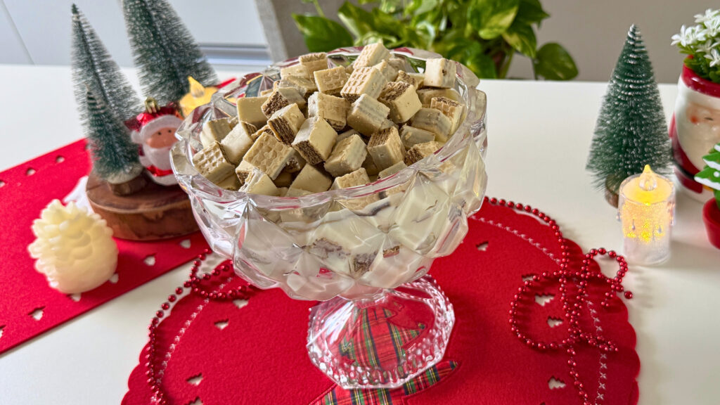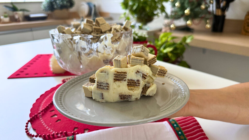- Em um refratário ou taça, monte as camadas começando pelo creme, depois o BIS picado e finalize com mais uma camada de creme.