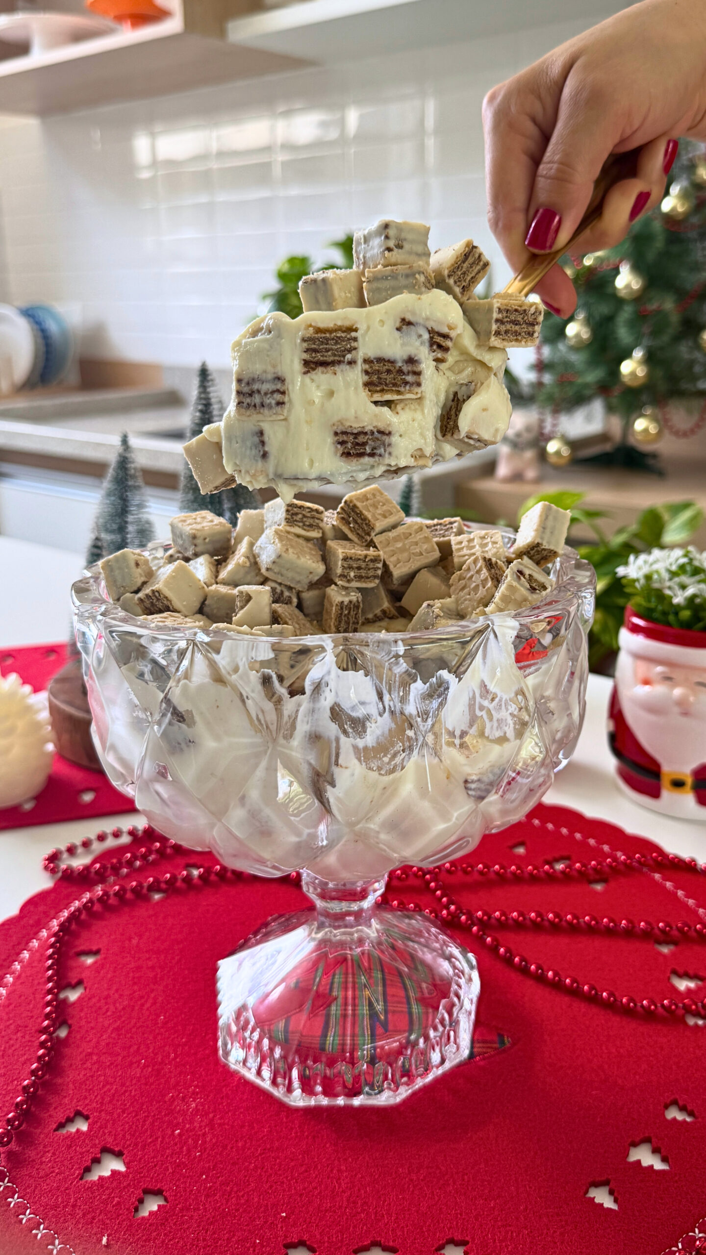 - Em um refratário ou taça, monte as camadas começando pelo creme, depois o BIS picado e finalize com mais uma camada de creme.