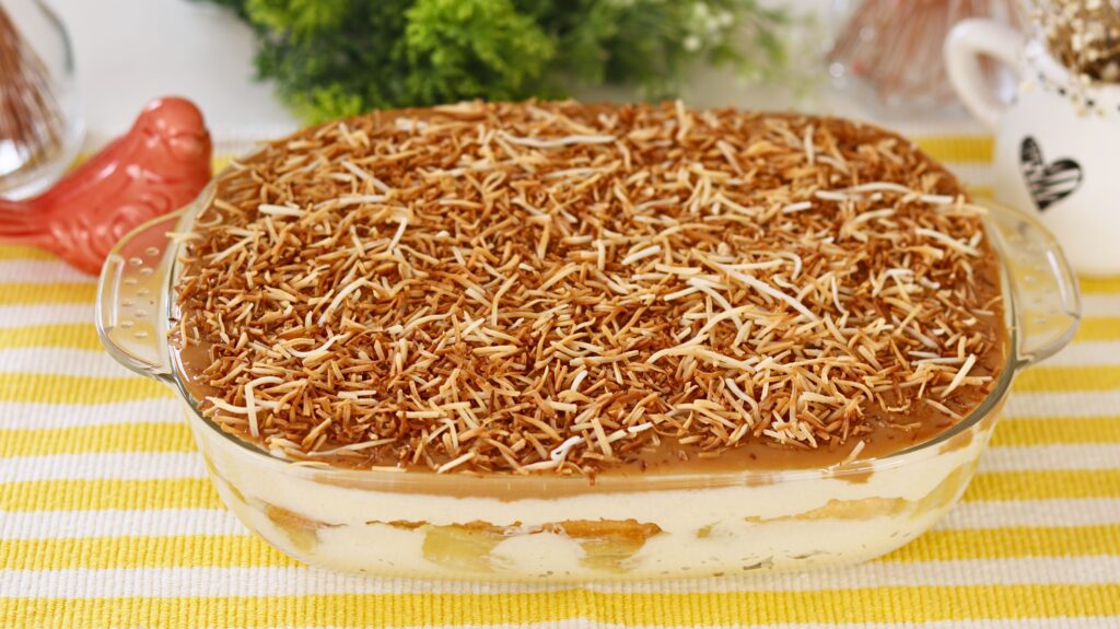 - Cubra com o creme de doce de leite e finalize decorando com o coco tostado.