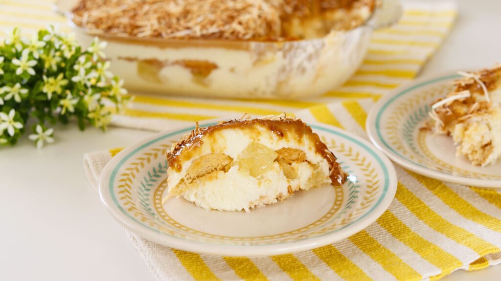 - Repita as camadas de creme de coco e doce de abacaxi.