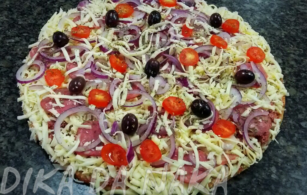 de cebola roxa, tomates cereja fatiado e azeitonas pretas. Termine com orégano