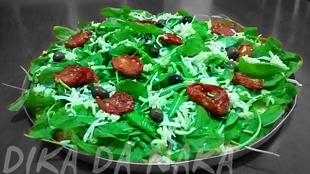 camada generosa de mussarela ralada e a rúcula. Decore com azeitonas pretas,