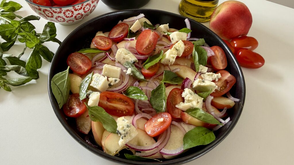 Leve, refrescante e cheia de charme, essa salada de pêssegos é perfeita para quem busca uma combinação diferente e sofisticada. O doce natural da fruta se equilibra com ingredientes frescos, criando um prato colorido, aromático e ideal para dias quentes ou para acompanhar refeições especiais. Simples de preparar e surpreendente no sabor, é daquelas receitas que encantam à primeira garfada!