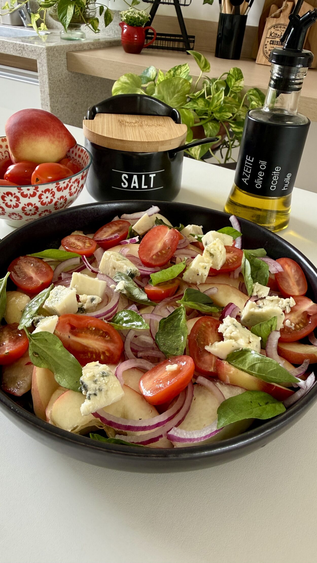 - Fatie os pêssegos frescos e coloque em um bowl, junto com a cebola roxa fatiada, os tomatinhos, o manjericão e o queijo. Reserve.