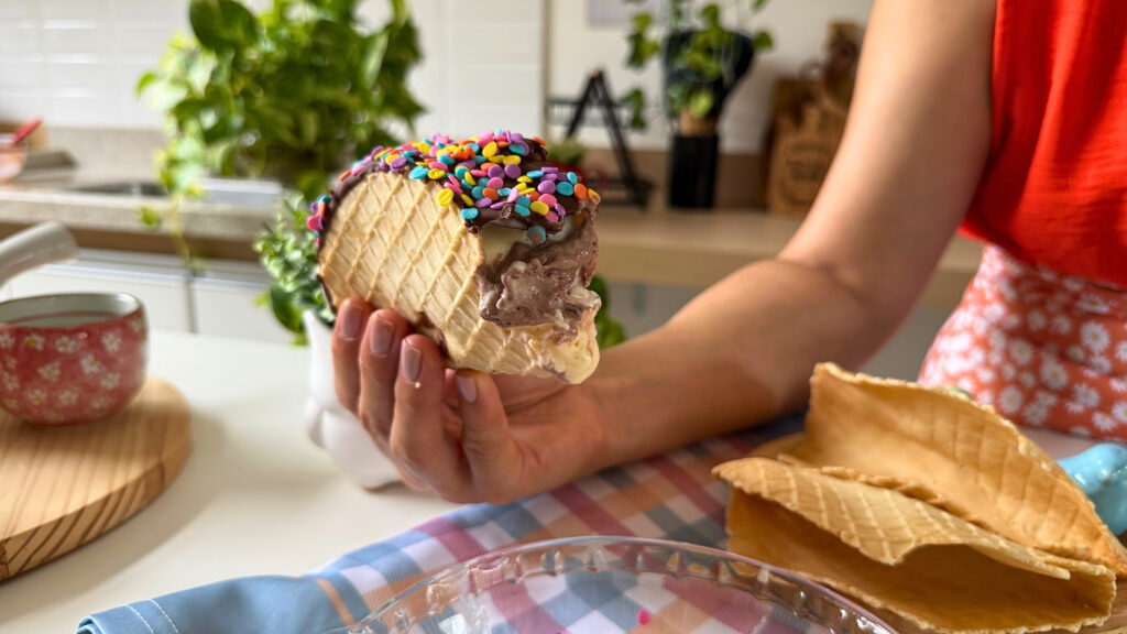 Feito com cone tipo cascão moldado em formato de taco, recheado com sorvete e finalizado com cobertura de chocolate e confeitos, ele encanta no primeiro olhar — e conquista na primeira mordida.