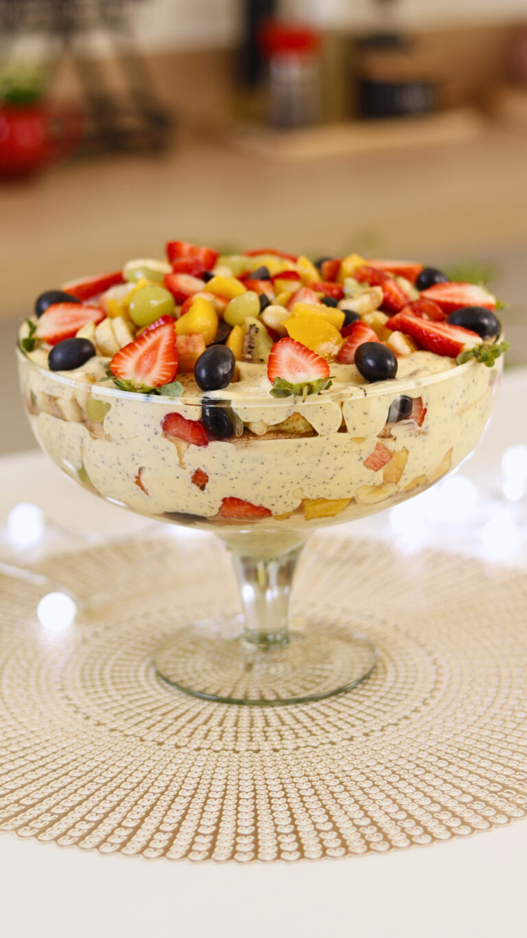 Se você está procurando uma sobremesa leve, refrescante e com aquela carinha festiva para encerrar a ceia de Ano Novo, este Pavê de Salada de Frutas é a escolha perfeita. Com camadas cremosas, biscoitos macios e uma mistura colorida de frutas, ele combina sabor, textura e praticidade — tudo que a gente ama nas festas!