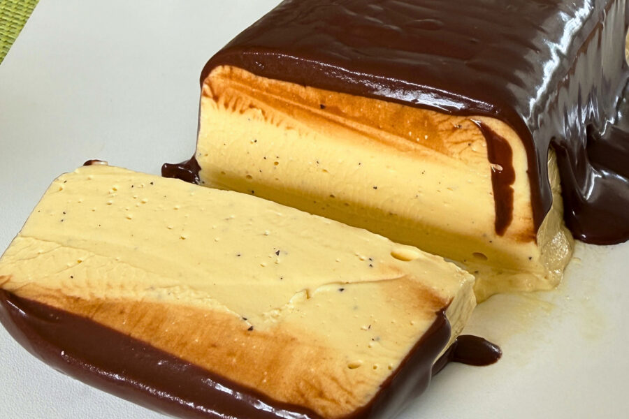 15. Retire o zuccotto do freezer, desenforme e despeje a ganache de chocolate.