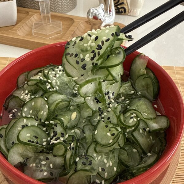 Esse sunomono de pepino é uma receita simples, tradicional da culinária japonesa e perfeita para acompanhar refeições ou servir como entrada. Com um equilíbrio delicioso entre o azedinho do vinagre de arroz e o toque suave do açúcar, ele fica ainda mais especial com gergelim por cima. Fácil de preparar e muito refrescante, é daquelas receitas que conquistam pela simplicidade.